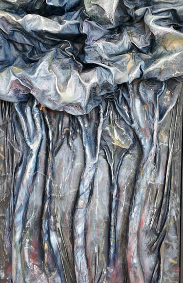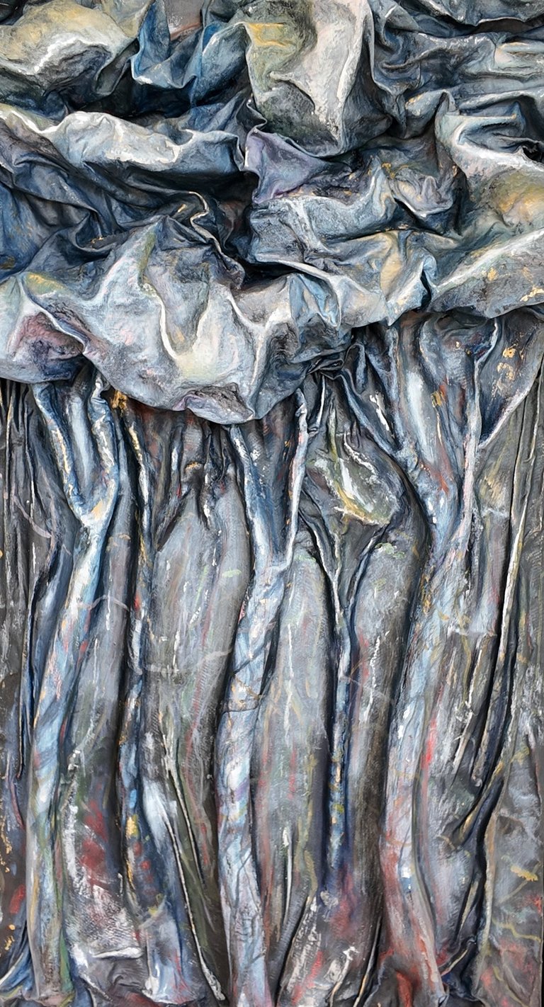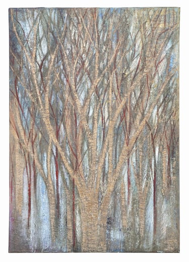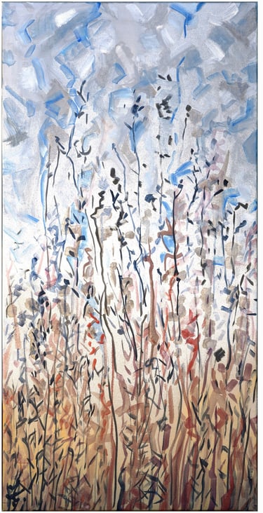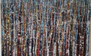 IL RAMO D'ORO Quest'opera si differenzia per la tecnica utilizzata. La tela, preparata con una combinazione di stucco e colla vinilica, offre una base unica che esalta i colori applicati. Dopo una stesura di diverse tonalità, ho impiegato la tecnica del "grattage" per far emergere la luce, creando un gioco affascinante tra ombra e luminosità. Questa metodologia non solo arricchisce l'opera dal punto di vista visivo, ma invita anche lo spettatore ad esplorare la profondità e le sfumature dei colori, trasmettendo un senso di dinamismo e vivacità.