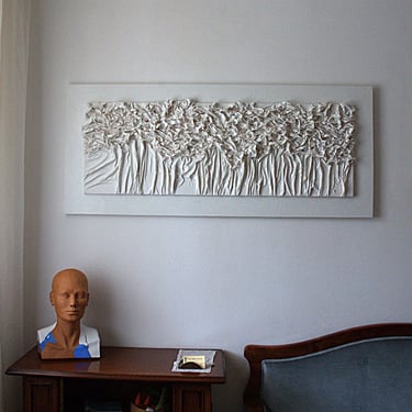 FILOBIANCO is a work of art created from cotton sheets, molded with a textural blend of glue, gesso, and stucco onto a wooden panel, following the shapes of trees and the natural folds of the material. Once dry, the surface is coated with white enamel, creating a luminous, tactile skin. A delicate white thread winds its way through the painting, inviting the viewer to a serene and spiritual exploration.