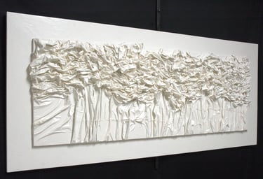 FILOBIANCO è un'opera d'arte che nasce da lenzuola di cotone, modellate con una miscela materica di colla, gesso e stucco su un pannello di legno, seguendo le forme degli alberi e le pieghe naturali del materiale. Una volta asciutto, la superficie viene rivestita con smalto bianco, creando una pelle luminosa e tattile. Un delicato filo bianco si snoda attraverso il dipinto, invitando lo spettatore a un'esplorazione serena e spirituale.
