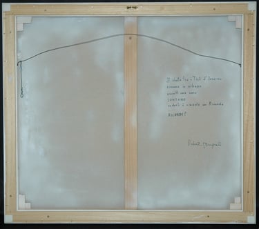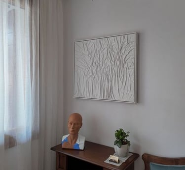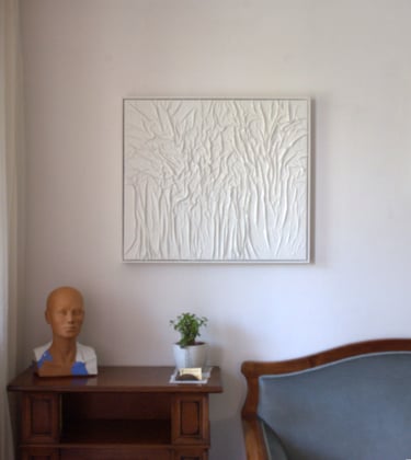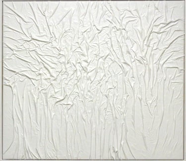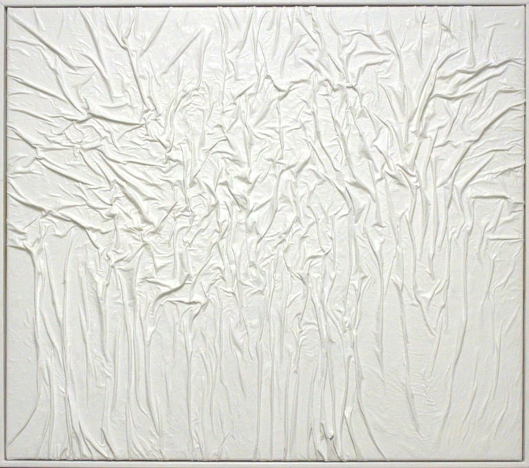 "IL VENTO TRA I TIGLI D'INVERNO" è un'opera a tecnica mista che invita alla quiete e alla contemplazione. Consiste nel modellare un tessuto di cotone, preparato con stucco e colla vinilica, direttamente sulla tela. Strati di smalto bianco completano l'opera.