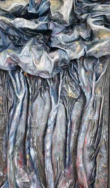 IL RAMO D'ORO Quest'opera si differenzia per la tecnica utilizzata. La tela, preparata con una combinazione di stucco e colla vinilica, offre una base unica che esalta i colori applicati. Dopo una stesura di diverse tonalità, ho impiegato la tecnica del "grattage" per far emergere la luce, creando un gioco affascinante tra ombra e luminosità. Questa metodologia non solo arricchisce l'opera dal punto di vista visivo, ma invita anche lo spettatore ad esplorare la profondità e le sfumature dei colori, trasmettendo un senso di dinamismo e vivacità.